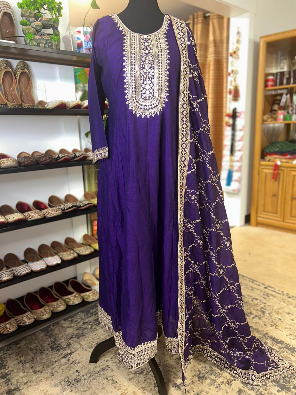 Fabric- Crape silk Size - XL Color Purple Machine Work Embroidery. Ready to Wear (Alteration included)