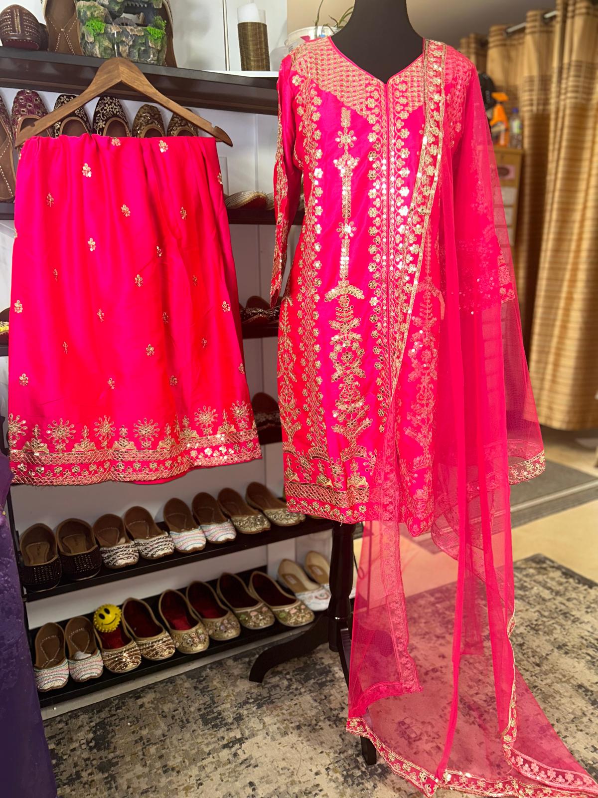 Fabric- Heavy Faux Georgette With Sequence work. Size - XL Color Hot Pink Loose Plazzo Pant Net Duptta Ready to Wear (Alteration included