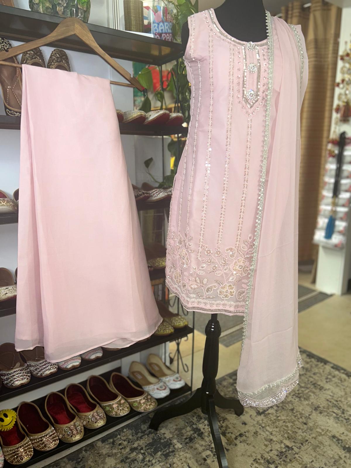 Fabric- Georgette With Sequence work. Size - Medium Color - Baby Pink Loose Plazzo Pant Net Duptta Ready to Wear (Alteration included