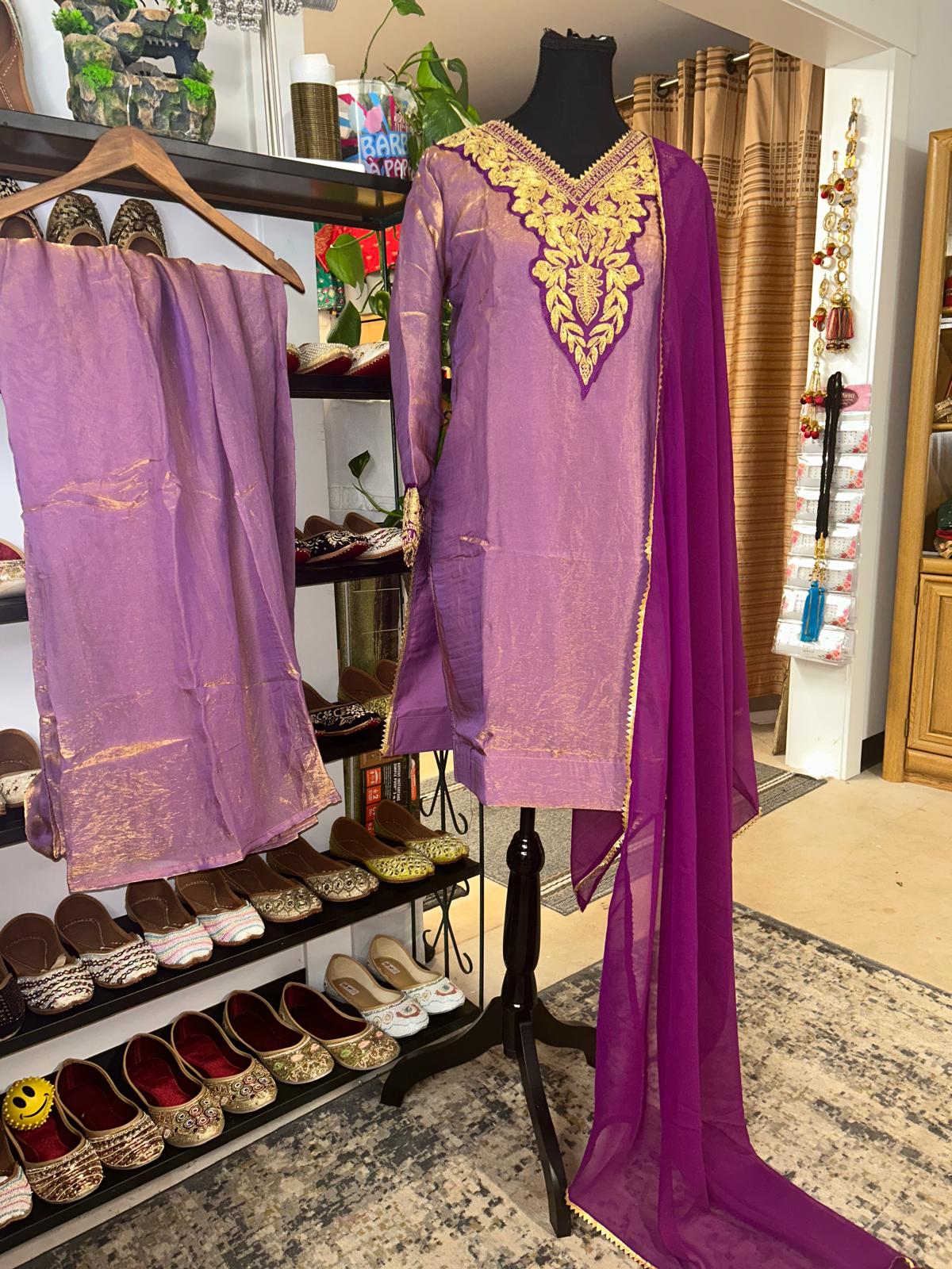 Fabric- Shimmer Sarten Patch work Neck Design Plazzo Pant Size - XL Color Purple Ready to Wear (Alteration included