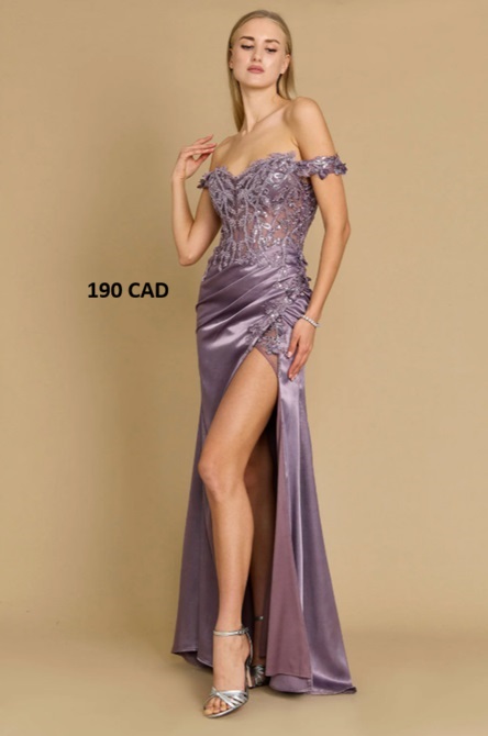 Fabric: Satin Corset Back Length: Full Length Sleeve Style: Off Shoulder Color: Violet Sizes: XS, S, M, L, XL