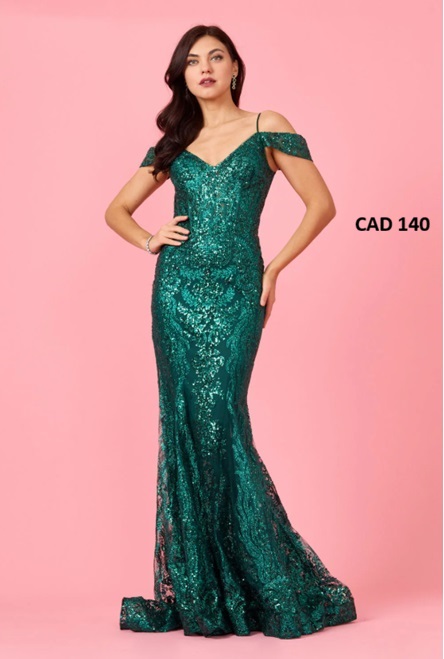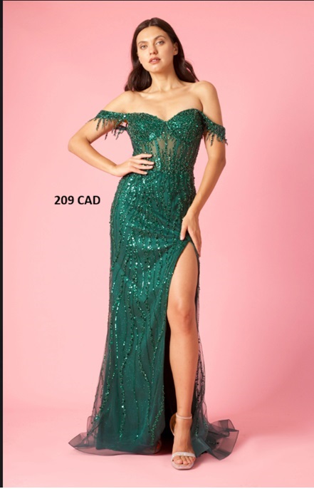 Fabric : Sequins Length : Full Length Sleeve Style : Off Shoulder Color : Emerald Green Sizes : 6, 8